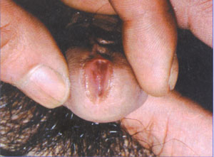 (2)有尿道分泌物及尿道红肿 分泌物常为浆液性或者黏液浓性。尿道口有分泌物,但较淋病的分泌物稀薄,为清稀状或淡黄色,分泌物量也较淋病少。在长时间未排尿或晨起初次排尿前溢出少量分泌物,污染内裤,结成黏糊状可封住尿道口(称为糊口)。