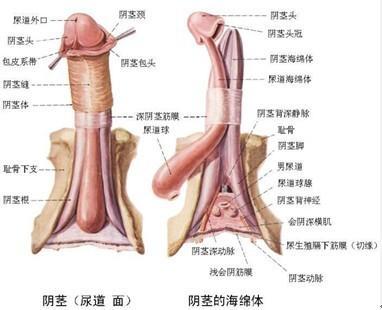 阴茎主要由三条海绵体组成,其中两条并排在阴茎背部,称为阴茎海绵体,另一条包绕着尿道,在阴茎的腹部,称为尿道海绵体。三条海绵体的外面包被着筋膜和皮肤。