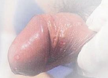 1.原发性生殖器疱疹:潜伏期2-10日,平均为6日。发病部位男性为包皮、龟头、冠状沟、阴茎。偶可见于尿道、前列腺和精囊。开始局部发红,灼热及轻痒,迅速演变为米粒大小红色丘疹,并很快变成水疱,3-5天后形成糜烂或浅溃疡、结痂,有疼痛,可伴有局部淋巴结肿大。